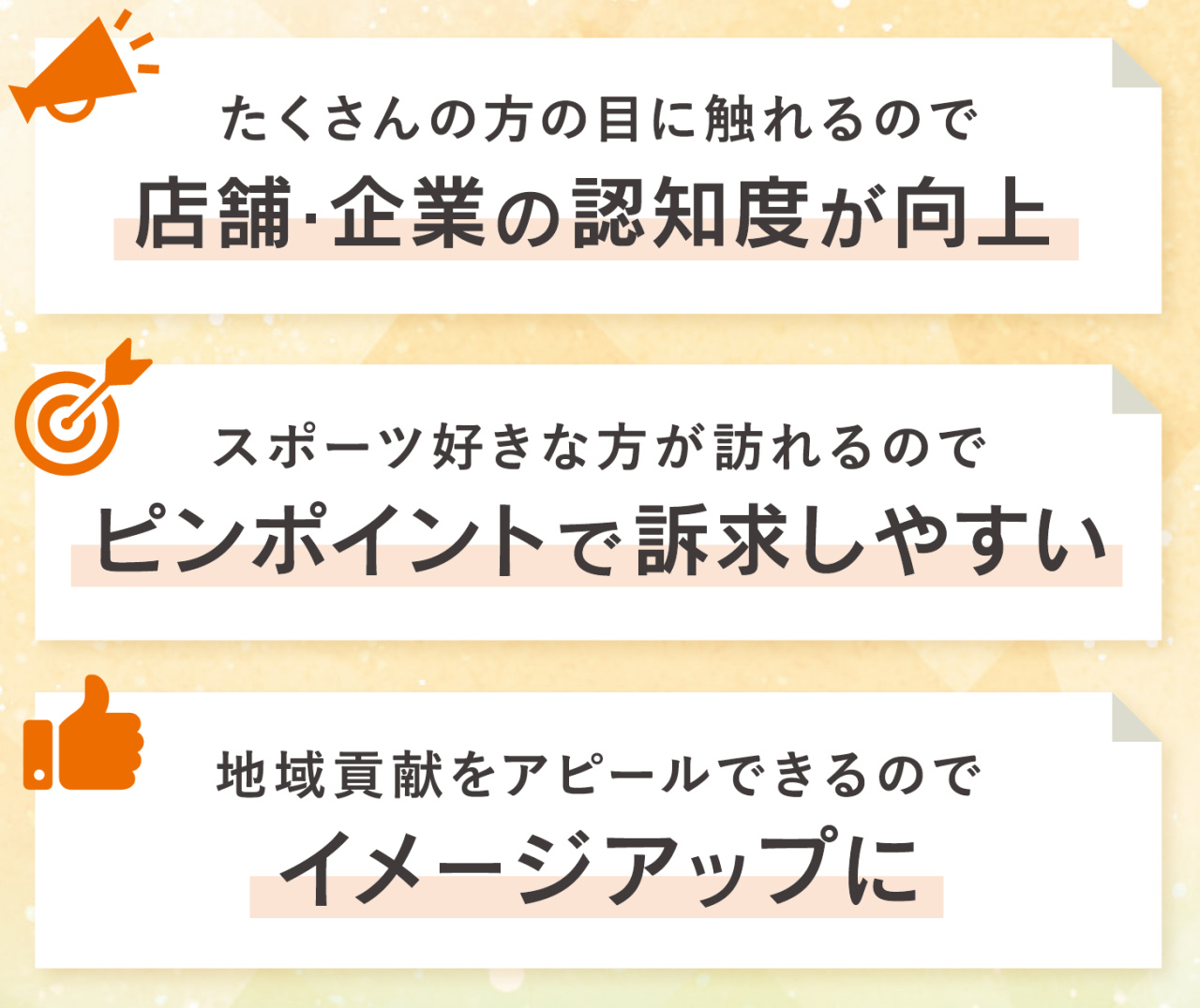 当ホームページは宜野湾地域だけでなく、地域外からも沢山のアクセスがあります。広告バナーを掲載することで沢山の方々へのPRに繋がりますし、エリアマーケティングに力を入れたい店舗・企業にピッタリです。またチラシのポスティングと同様の効果も期待出来ます。スポーツ応援を通して地域社会への貢献にも繋がります。なによりも応援することで地域の皆様からの応援が帰ってきます。